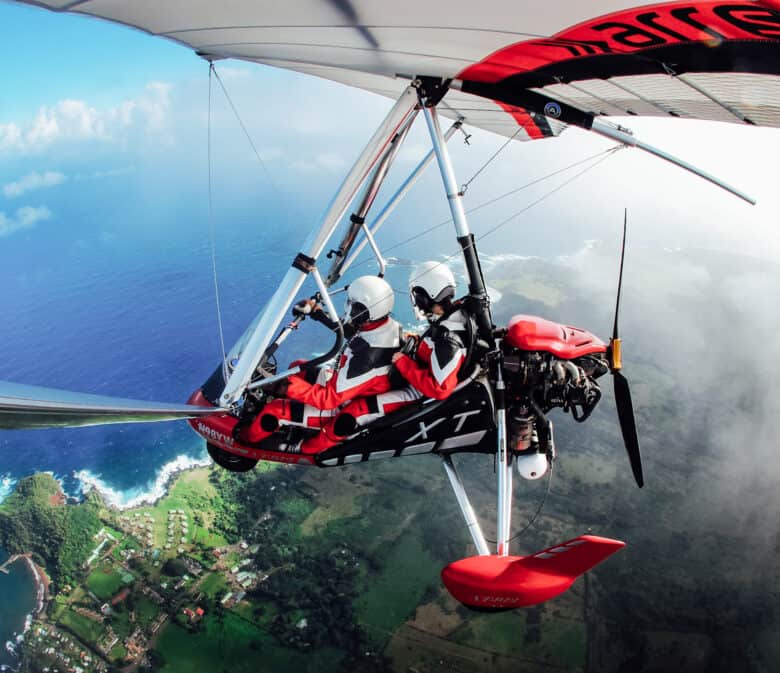 The hang gliding in Maui differs from the traditional gliders where you propel yourself off a cliff supported by the wind alone. You will be flying in what is referred to as an ultra-light or micro-light aircraft which is essentially a hang glider with a small powered engine and a spot to sit. Instead of running off a cliff to gain momentum in this case, you will actually take off from a landing strip. Specifically, the aircraft youโll be flying in is known as an Airborne XT 912.